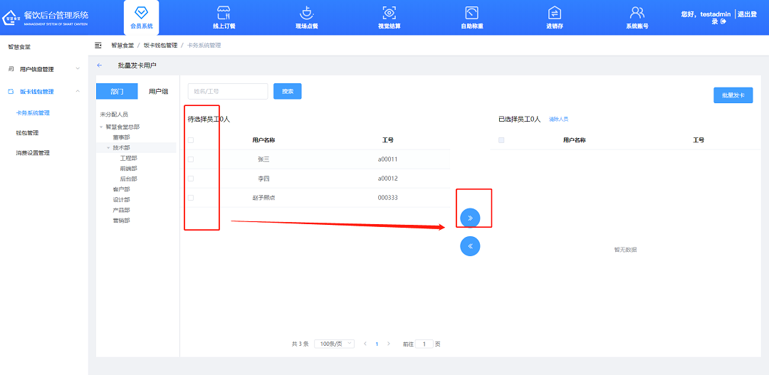 ②在部門、用戶主或者自行添加的組類選擇需要添加的人員(或者通過搜索框搜索需要添加的人員),勾選用戶名稱的前面的選項,點(diǎn)擊“箭頭”按鈕,移動到右邊(若不需要,可點(diǎn)擊“清楚人員”按鈕移除選項),再點(diǎn)擊“批量發(fā)卡”進(jìn)入下一個“計出配置”彈窗;