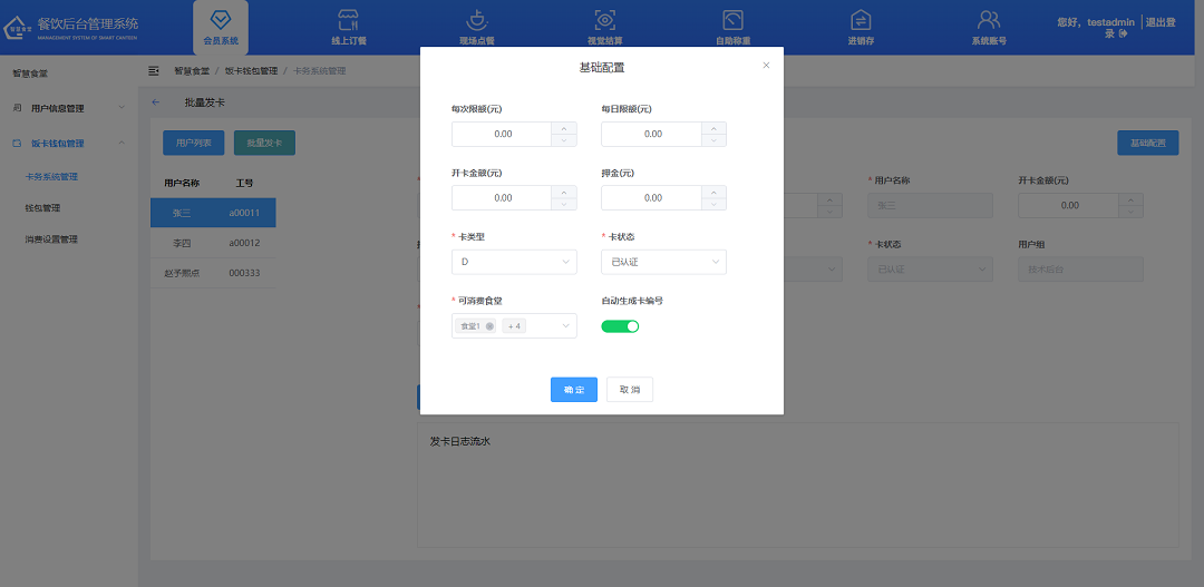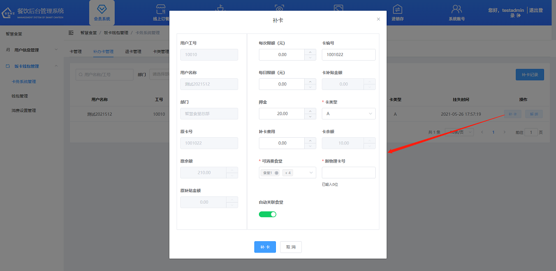 ②設(shè)置用戶的每日限額、卡編號、每日限額、押金、補(bǔ)卡費(fèi)用、新物理卡號;選擇卡類型、可消費(fèi)食堂;設(shè)置是否自動關(guān)聯(lián)食堂;