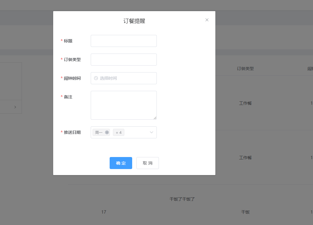 ①點擊“添加”按鈕添加標(biāo)題、訂餐、類型、鬧鐘時間、設(shè)置推送日期等信息;
