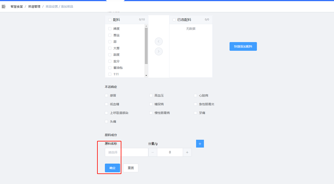 ④勾選不宜進食此菜品的特殊病癥(用于醫(yī)院),若無此需求可不勾選;