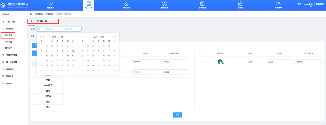 ①點擊“批量設置”按鈕,可進行批量排菜。例如:12月2號至6號(周一至周五)的晚餐,要排的菜都是相同的,就可使用此功能選擇對應日期段后批量發(fā)布。