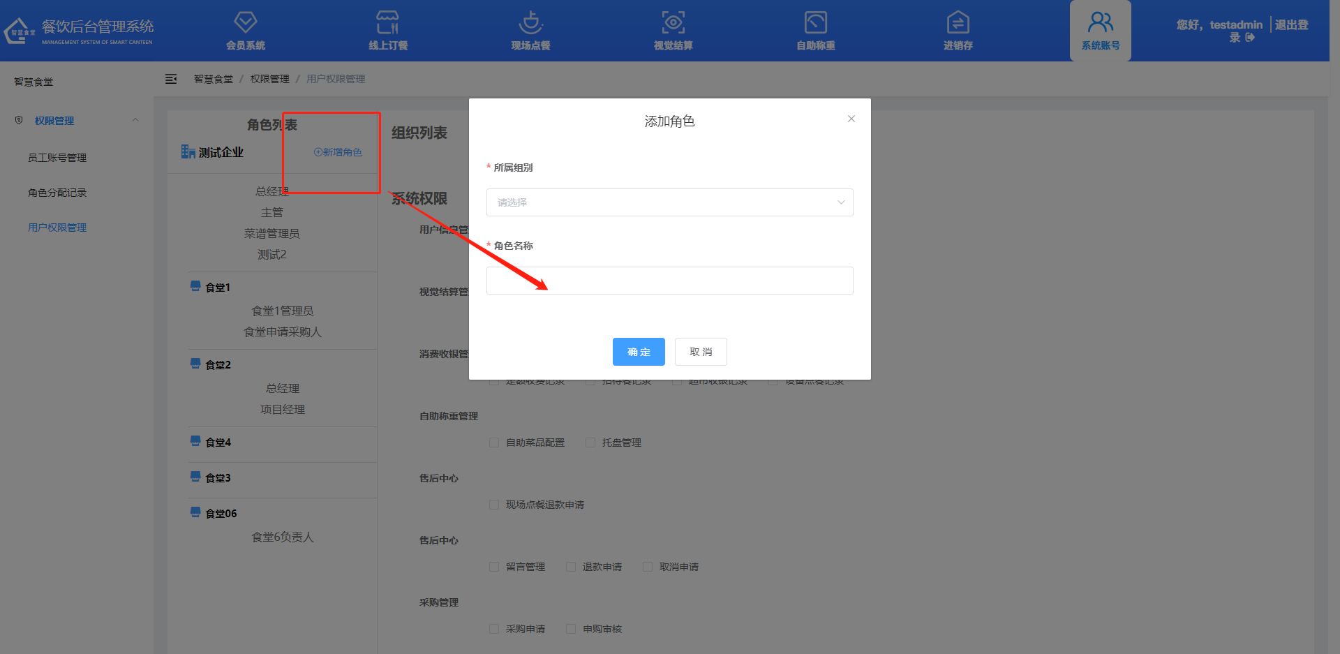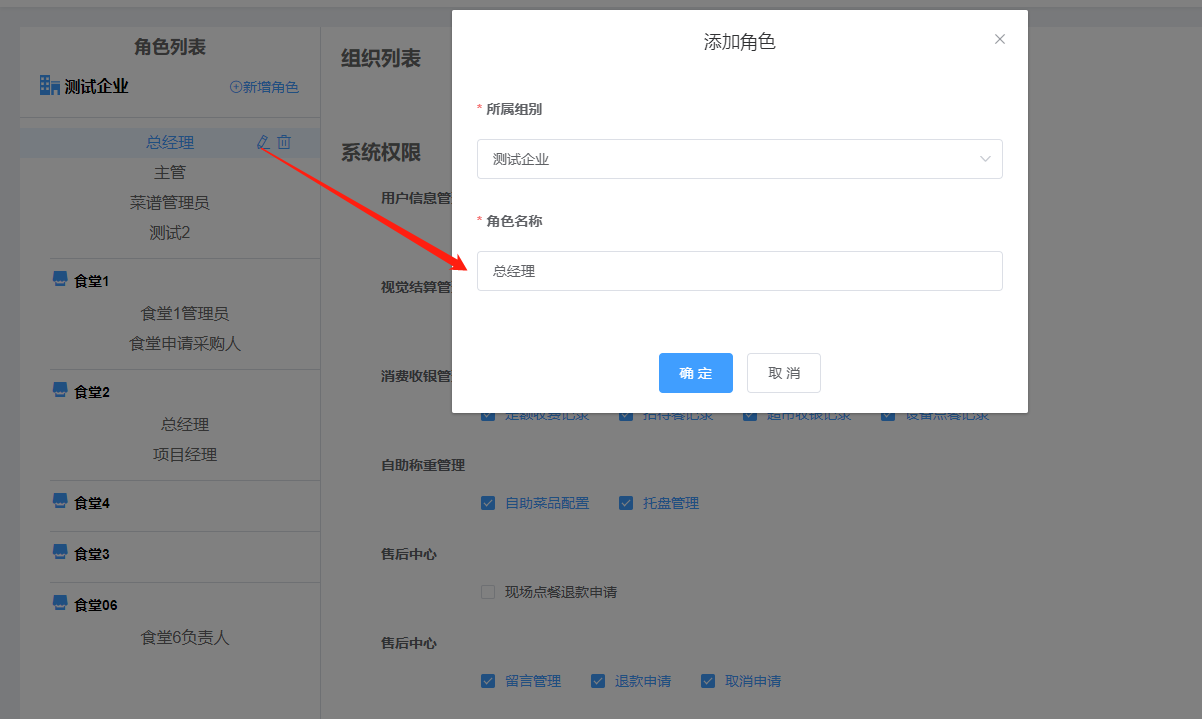 列表按不同食堂顯示角色名稱,點擊任意一個名稱,可對角色權(quán)限進行修改。