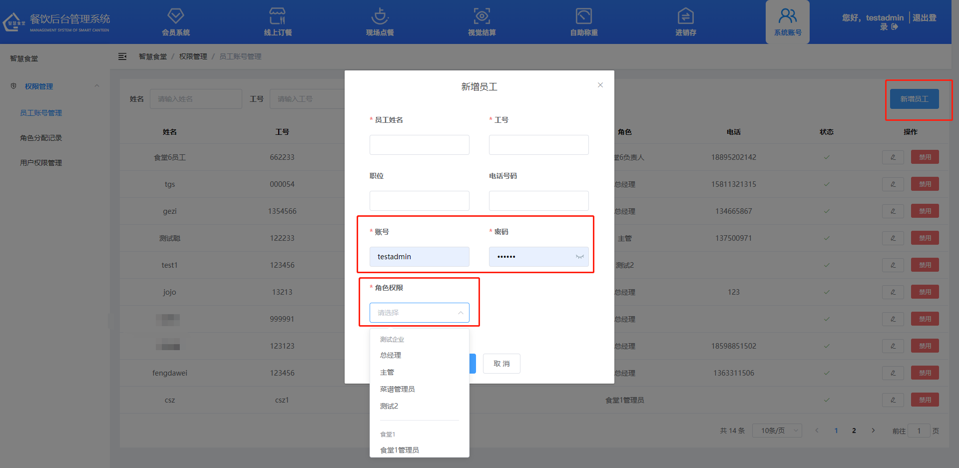 ②輸入員工姓名、工號、職位、電話號碼、賬號、密碼、角色權(quán)限等信息。