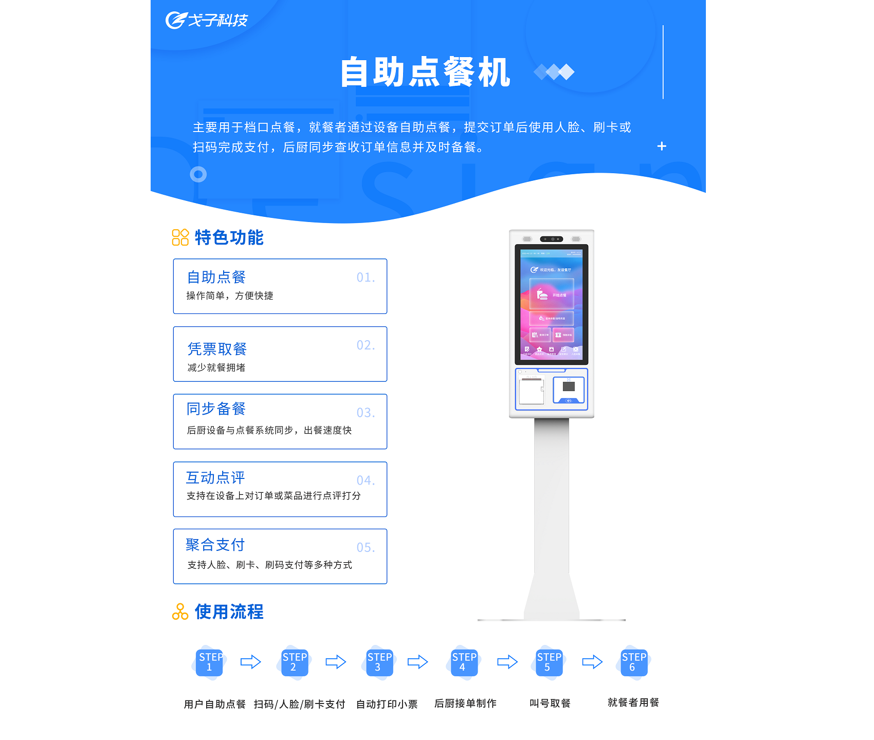 戈子科技自助點(diǎn)餐機(jī)有效利用自助點(diǎn)餐系統(tǒng)搭合理搭配叫號(hào)取餐系統(tǒng),人臉收銀等設(shè)備硬件,無(wú)縫整合智慧餐廳的前端硬件和軟件,后廚系統(tǒng),實(shí)現(xiàn)對(duì)餐廳的集成化智能管理。在提高用戶點(diǎn)餐訂購(gòu)效率和餐廳管理的同時(shí)提升顧客整體點(diǎn)餐體驗(yàn)與餐廳檔次。